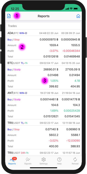 The [Trades] screen contains a full information about trades executed.